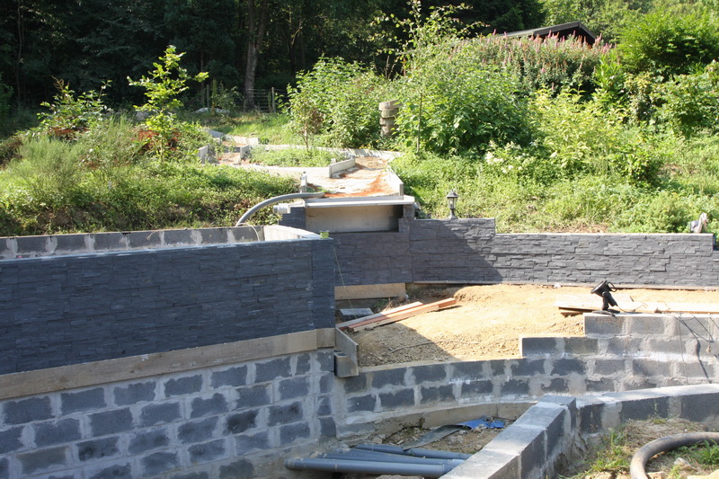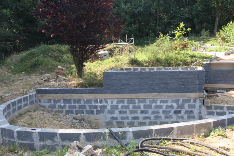 Première opération 2013, placement de plaquette en pierre naturel décorative, je sais c'est bizarre de commencer par ça mais il y a une raison simple, l'accessibilité, en effet lorsque le bassin sera rempli le mur du local technique ne sera plus accessible !